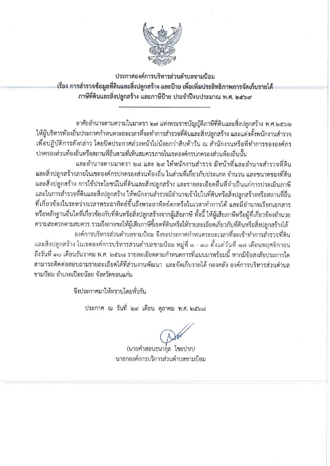 เรื่อง การสำรวจข้อมูลที่ดินและสิ่งปลูกสร้าง และป้าย เพื่อเพิ่มประสิทธิภาพการจัดเก็บรายได้ภาษีที่ดินและสิ้งปลูกสร้าง และภาษีป้าย ประจำปีงบประมาณ พ.ศ.2569
