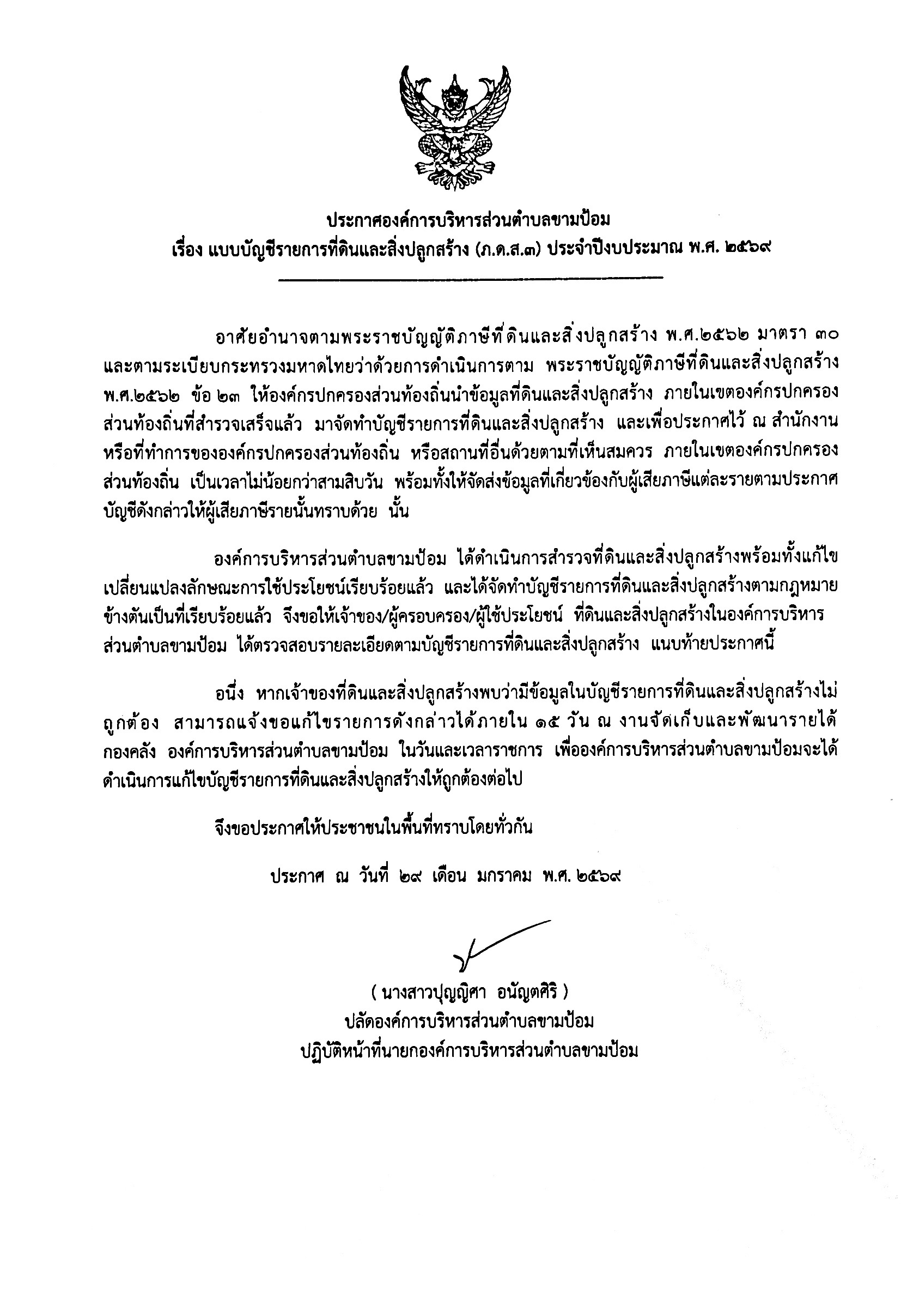 เรื่อง การสำรวจข้อมูลที่ดินและสิ่งปลูกสร้าง และป้าย เพื่อเพิ่มประสิทธิภาพการจัดเก็บรายได้ภาษีที่ดินและสิ้งปลูกสร้าง และภาษีป้าย ประจำปีงบประมาณ พ.ศ.2569 |